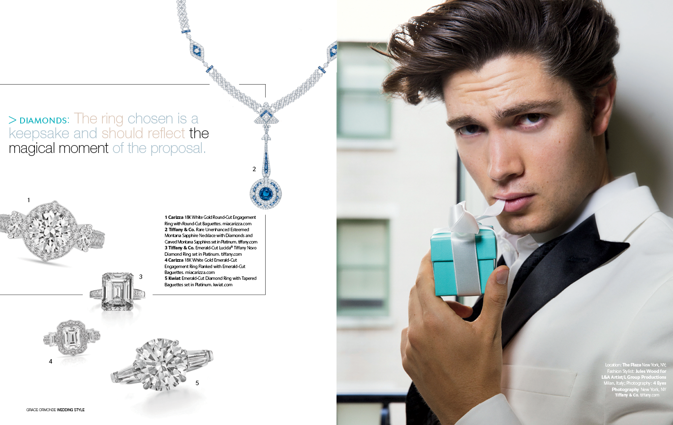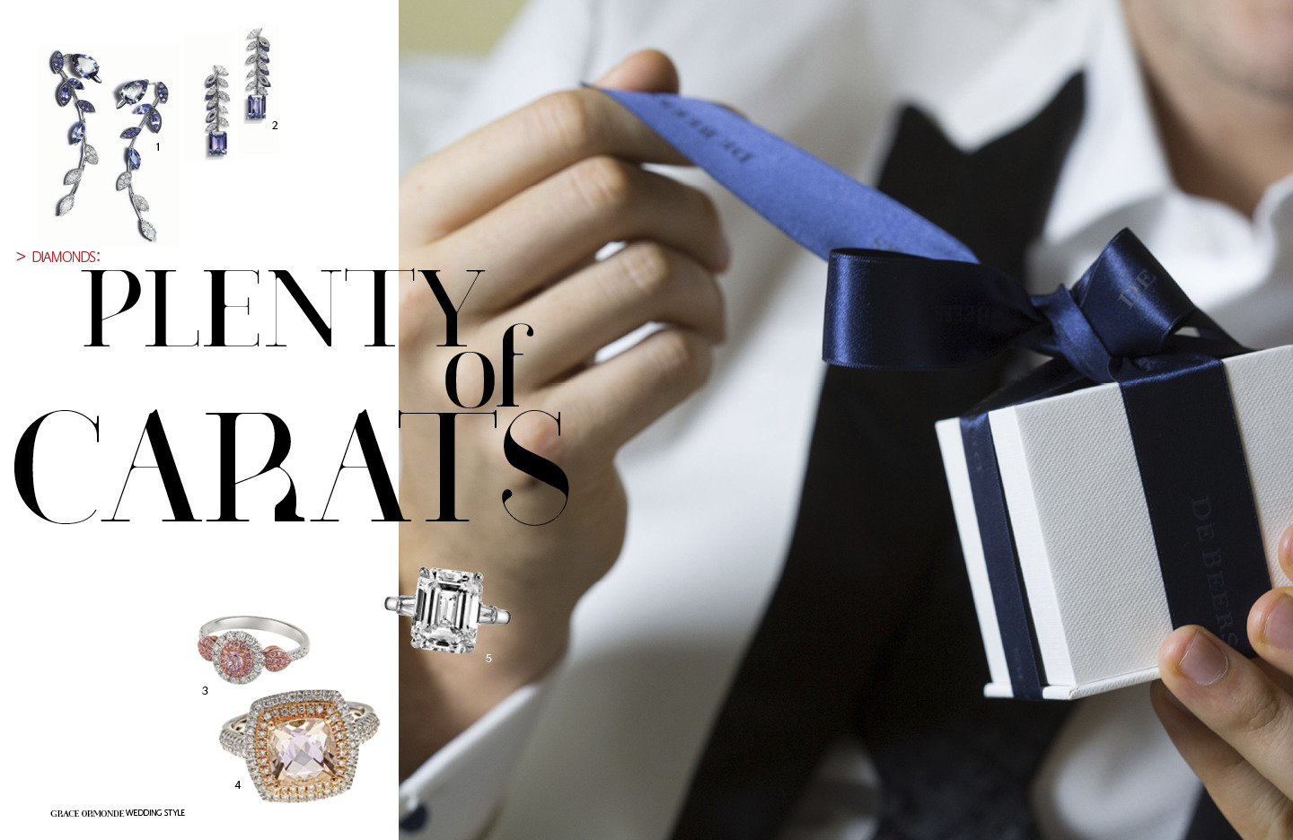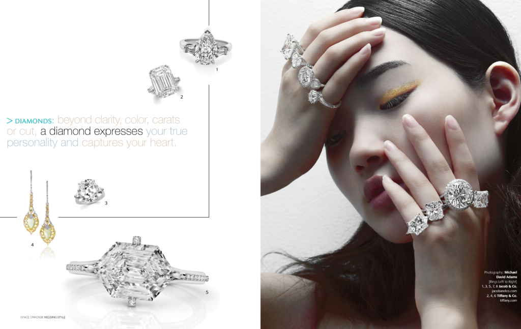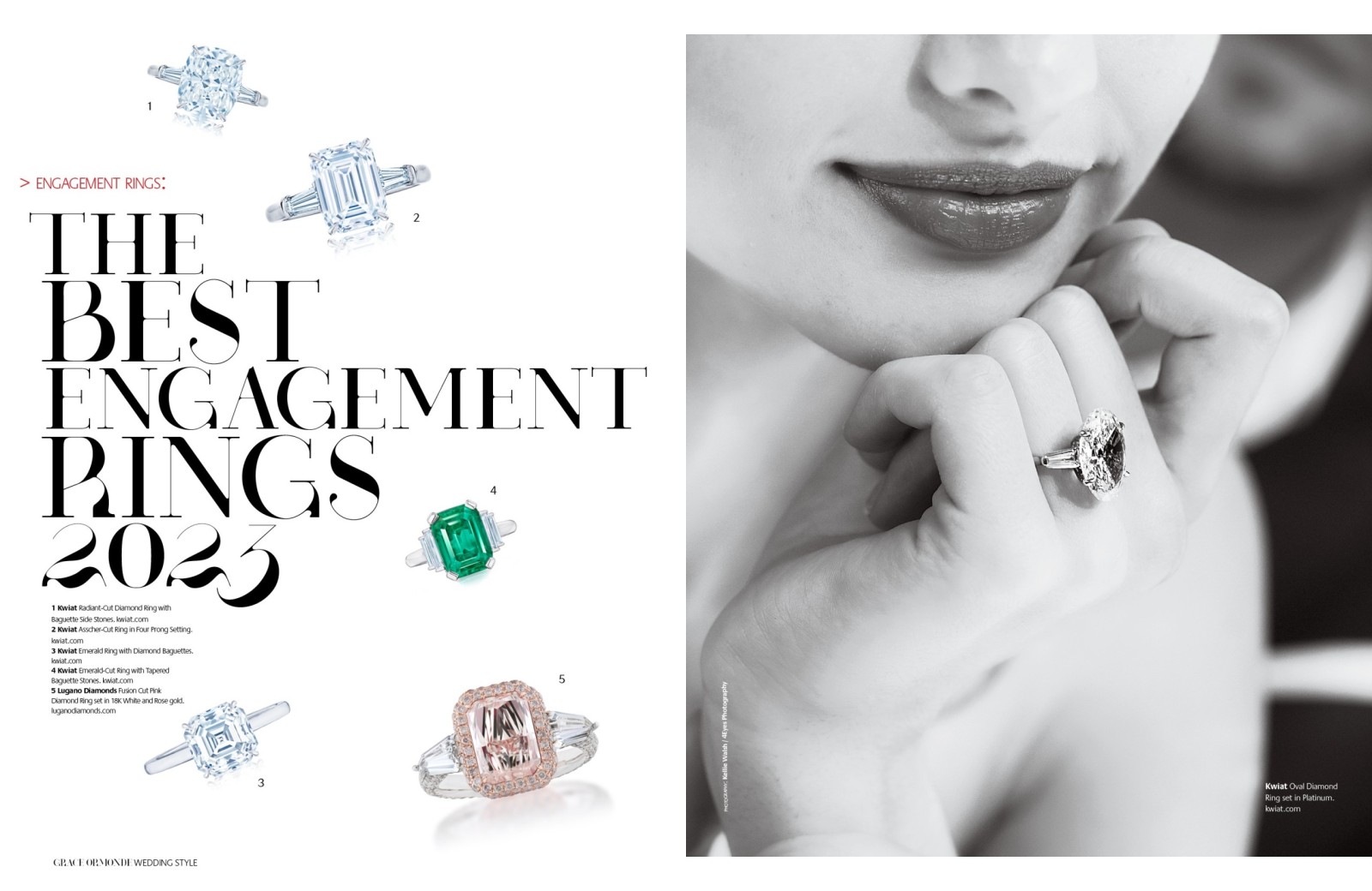 As Seen in Grace Ormonde Wedding Style Photography by: Kellie Walsh, 4 Eyes Photography Oval Diamond Ring set in Platinum Kwiat1 Kwiat Radiant-Cut Diamond Ring with Baguette Side Stones. 2. Kwiat Asscher-Cut Ring in Four Prong Setting. 3. Kwiat Emerald Ring with Diamond Baguettes. 4. Kwiat Emerald-Cut Ring with Tapered Baguettes Stones. 5. Lugano Diamond Fusion Cut Pink