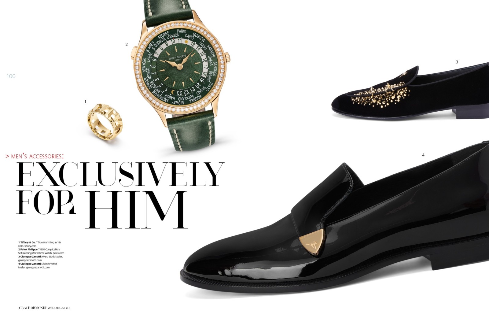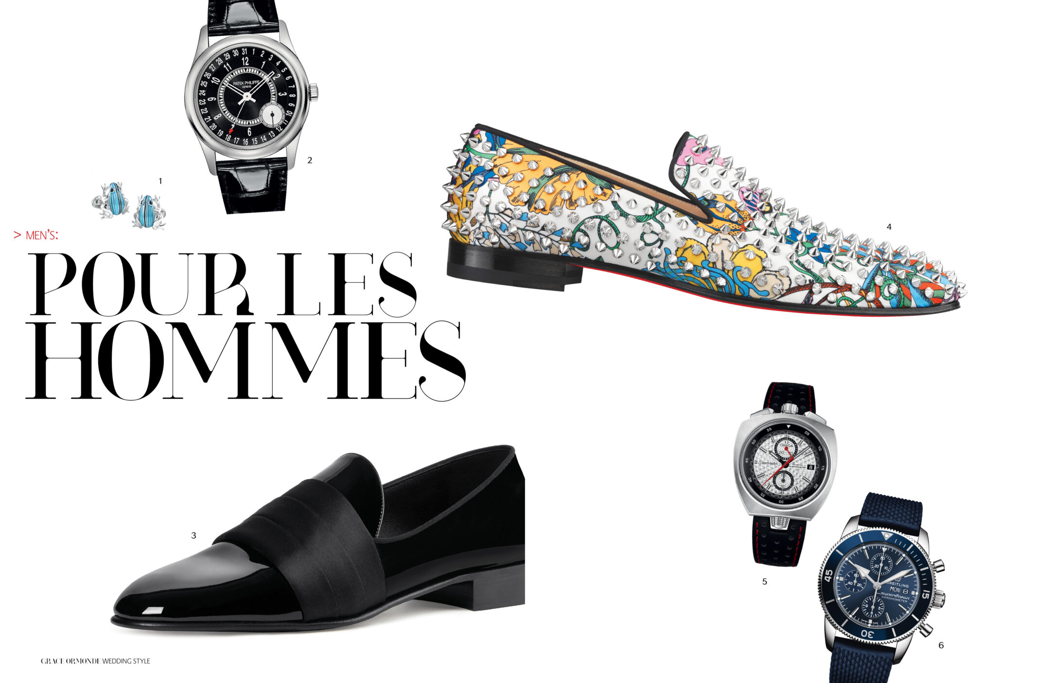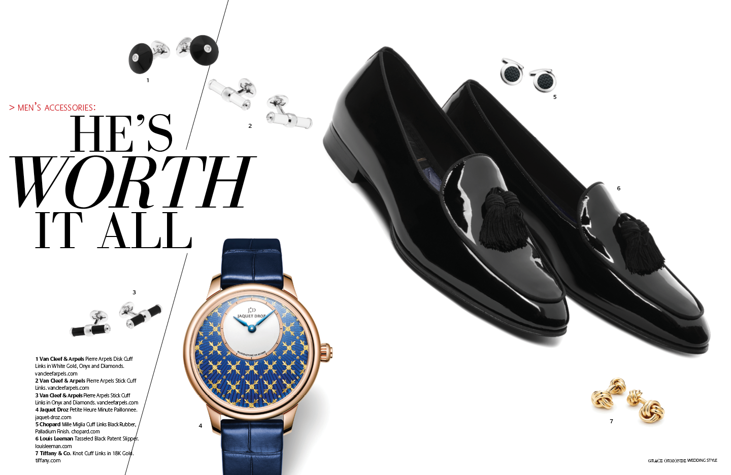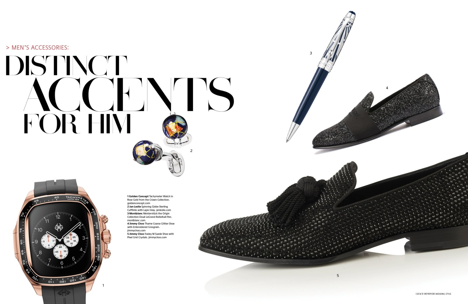 1 Piaget Polo Perpetual Calendar Obsidian Watch. 2 Seaman Schepps Cushion Cufflinks in Blue Topaz and Sapphire. 3 Ulysse Nardin Diver Watch. 4 Seaman Schepps Lapis Bar Cufflinks. 5 Jimmy Choo Foxley Loafer Black with Tassel.MEN’S ACCESSORIES: DISTINCT ACCENTS FOR HIM1 Ulysse Nardin Diver Watch. 2 Brunello Cucinelli Calfskin Loafers. 3 Soul of Nomad Leather Golf Bag.