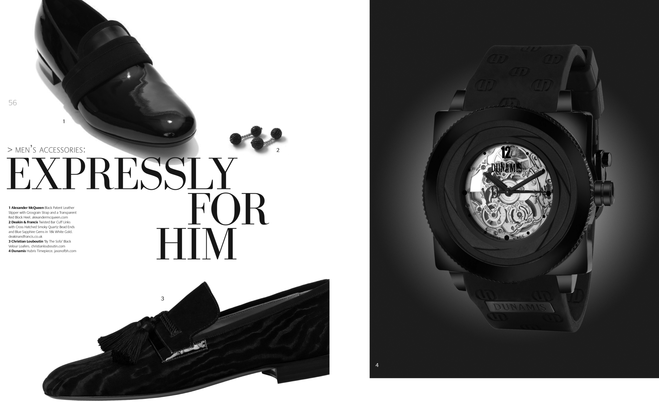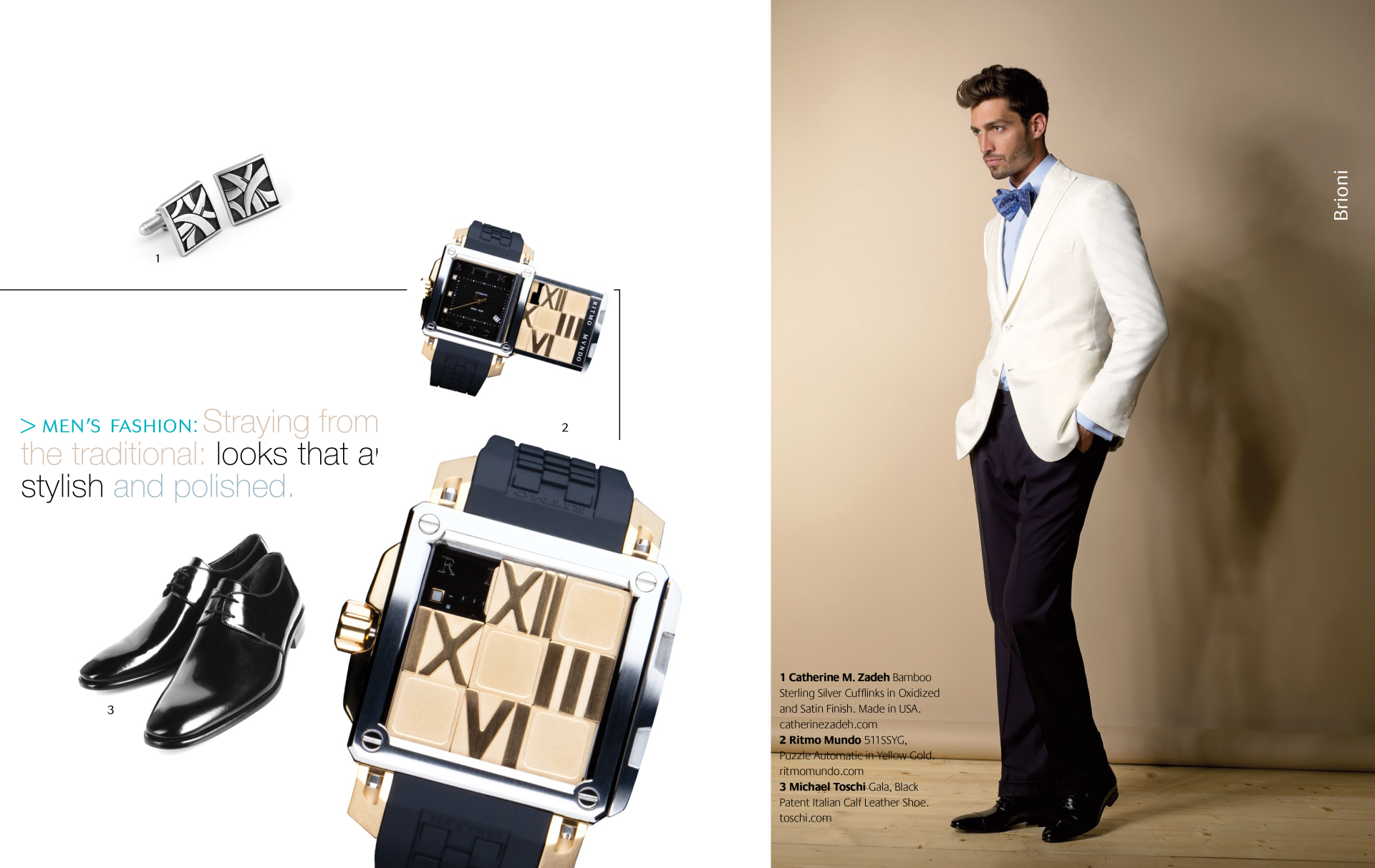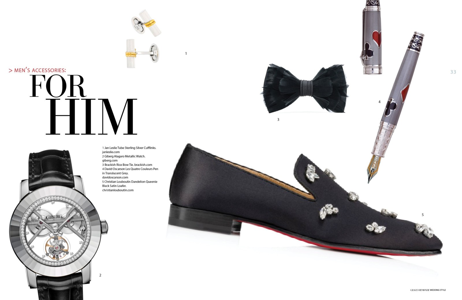 1 Piaget Polo Perpetual Calendar Obsidian Watch. 2 Seaman Schepps Cushion Cufflinks in Blue Topaz and Sapphire. 3 Ulysse Nardin Diver Watch. 4 Seaman Schepps Lapis Bar Cufflinks. 5 Jimmy Choo Foxley Loafer Black with Tassel.MEN’S ACCESSORIES: DISTINCT ACCENTS FOR HIM1 Ulysse Nardin Diver Watch. 2 Brunello Cucinelli Calfskin Loafers. 3 Soul of Nomad Leather Golf Bag.