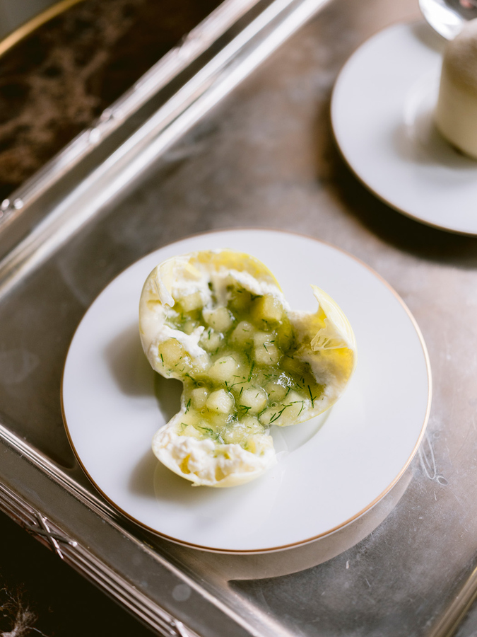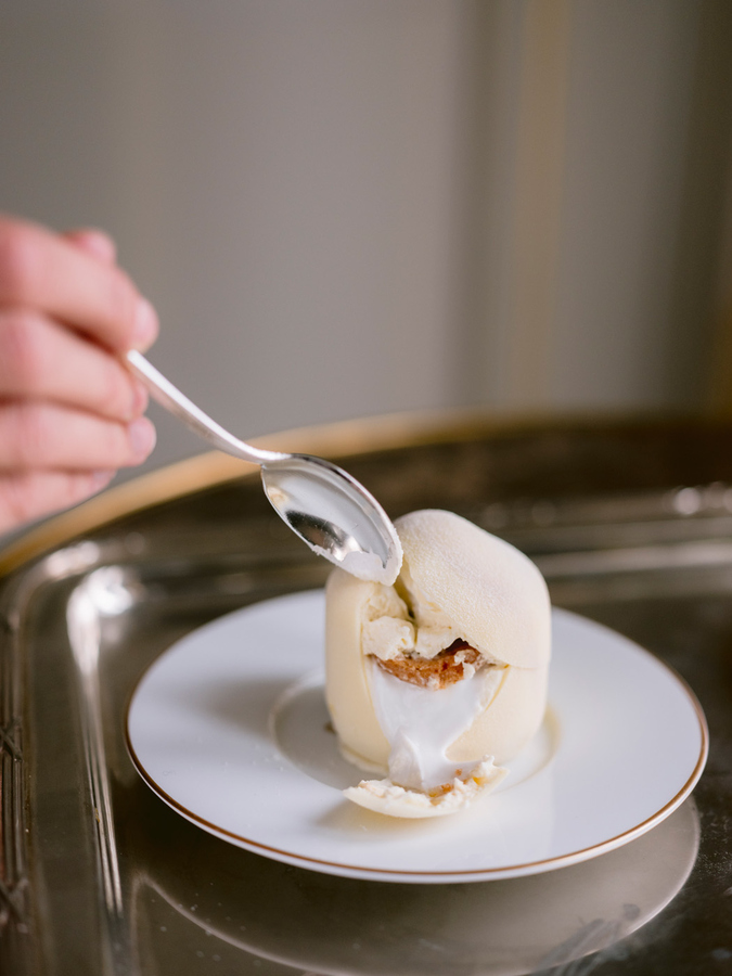 For Meghan, the morning of her proposal started off like a scene from a movie. Kevin left “to go Christmas shopping,” and Megan relaxed alone in the room while eating some delectable Cedric Grolet pastries. While she was enjoying the view of Paris at Le Meurice, someone knocked at the door. A room service attendant entered holding a large white box and a pair of shoes. Meghan was shocked by the surprise, which was made even more grand when a makeup artist arrived to help her get ready for two blissful hours. Finally, she made her way downstairs where Kevin was waiting for her by the hotel entrance.