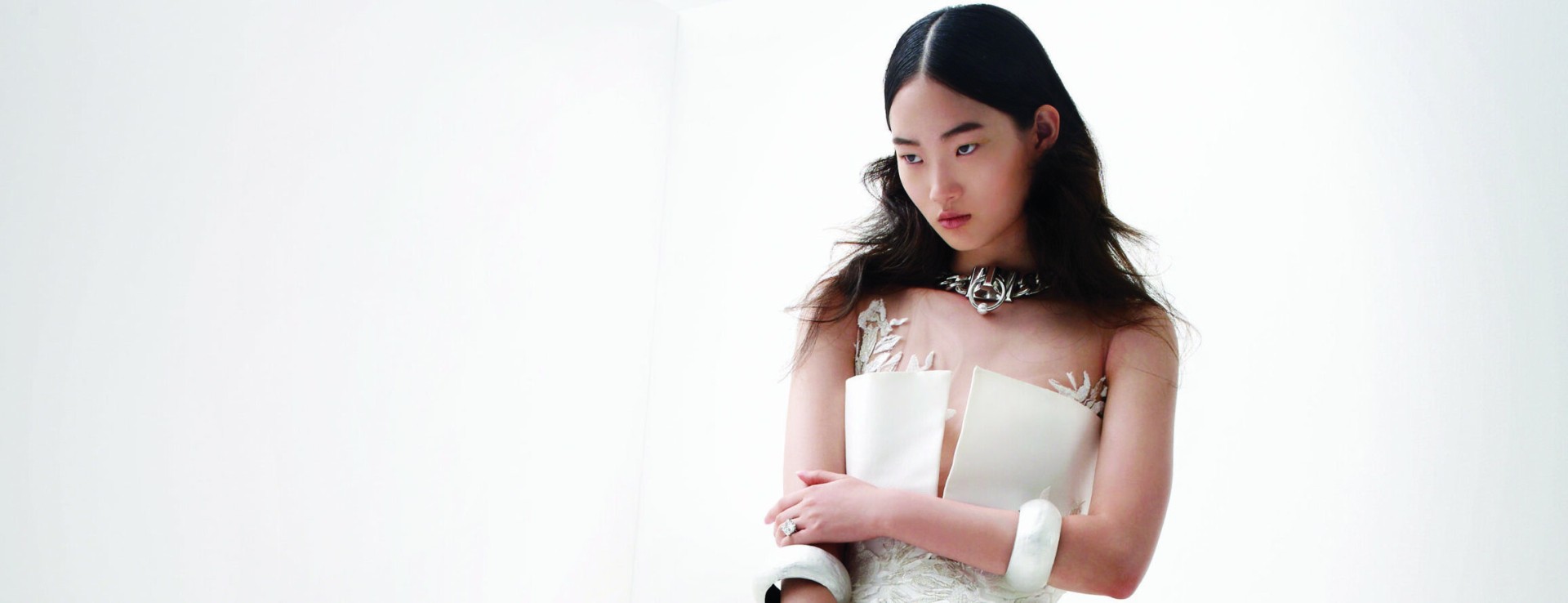 RIME ARODAKY – FALL 2024 BRIDAL COLLECTION For this collection, Rime Arodaky drew inspiration from the ethereal dance of celestial bodies, the mysteries of the universe and the spiritual realms beyond our sight. Down the runway, gowns shimmered like constellations – with patterns that traced the trajectories of comets, and silhouettes that echoed the graceful