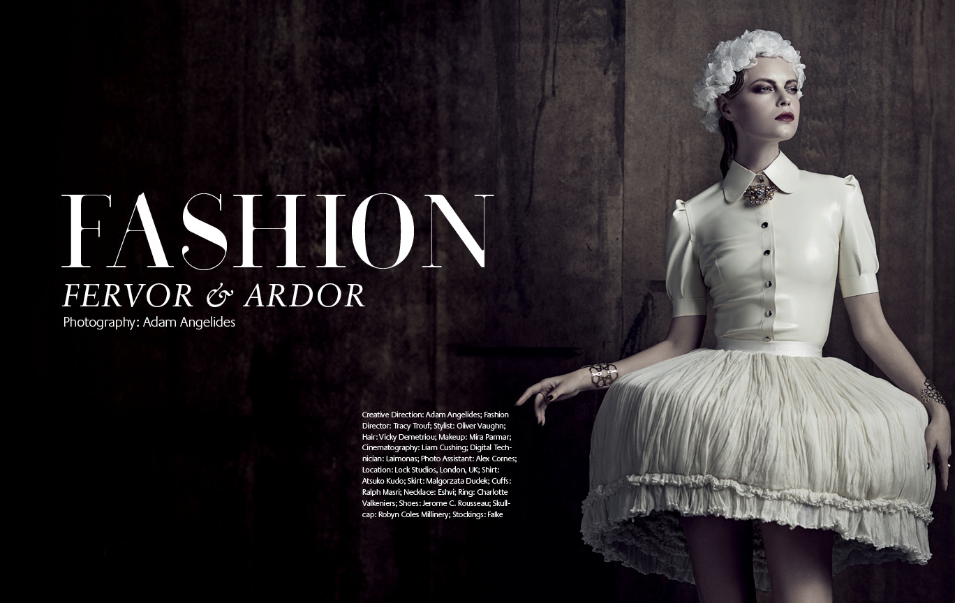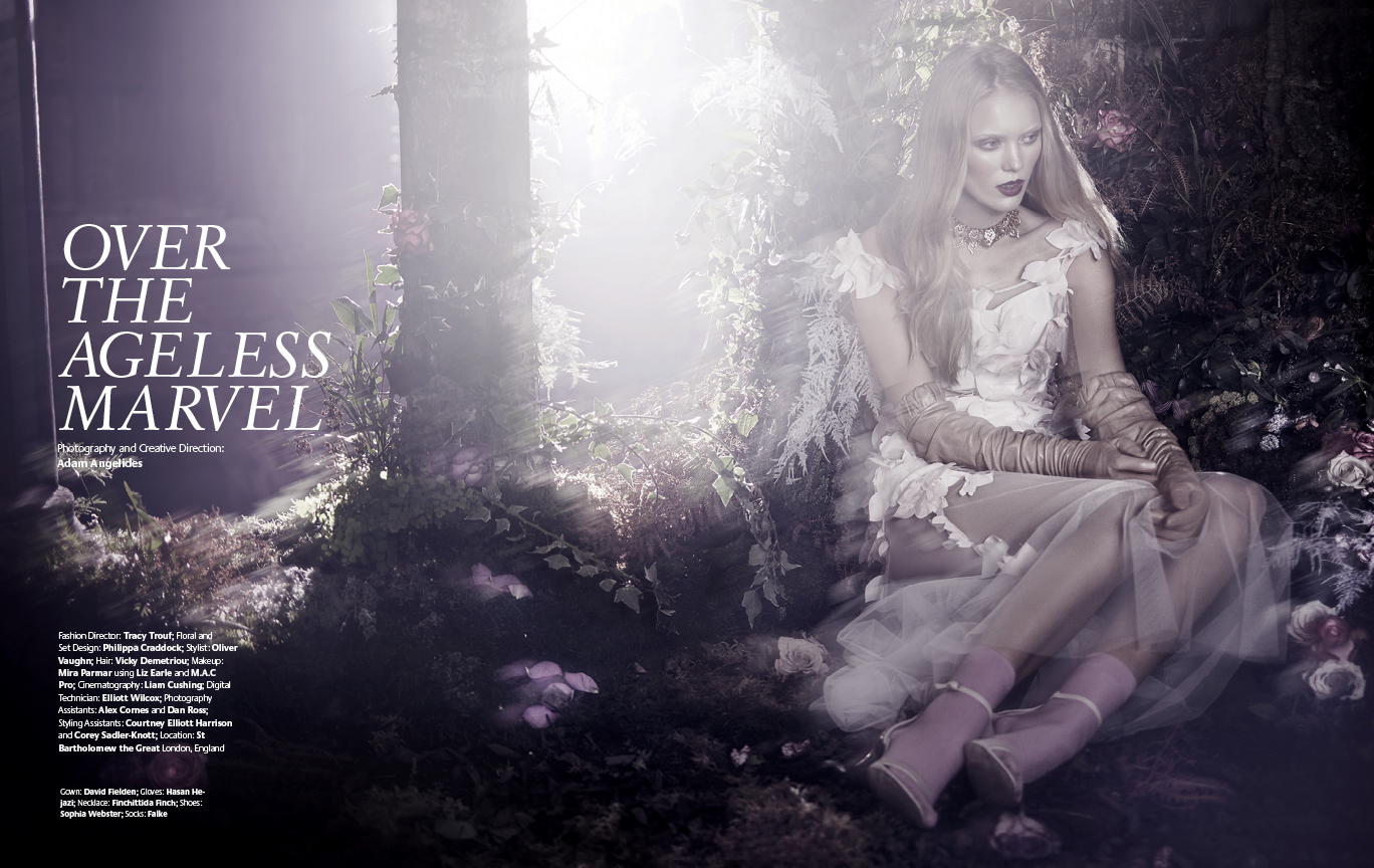 Photography and Creative Direction: Adam Angelides; Fashion Director: Tracy Trouf; Floral and Set Design: Philippa Craddock; Stylist: Oliver Vaughn; Hair: Vicky Demetriou; Makeup: Mira Parmar using Liz Earle and M.A.C Pro; Cinematography: Liam Cushing; Digital Technician: Elliott Wilcox; Photography Assistants: Alex Cornes and Dan Ross; Styling Assistants: Courtney Elliott Harrison and Corey Sadler-Knott; Location: St