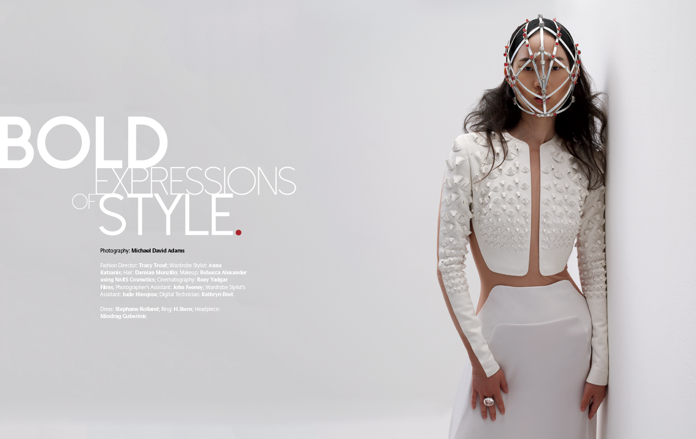Creative Direction: Adam Angelides; Fashion Director: Tracy Trouf; Stylist: Oliver Vaughn; Hair: Vicky Demetriou; Makeup: Mira Parmar; Cinematography: Liam Cushing; Digital Technician: Laimonas; Photo Assistant: Alex Cornes; Location: Lock Studios, London, UK; Shirt: Atsuko Kudo; Skirt: Malgorzata Dudek; Cuffs: Ralph Masri; Necklace: Eshvi; Ring: Charlotte Valkeniers; Shoes: Jerome C. Rousseau; Skullcap: Robyn Coles Millinery; Stockings: