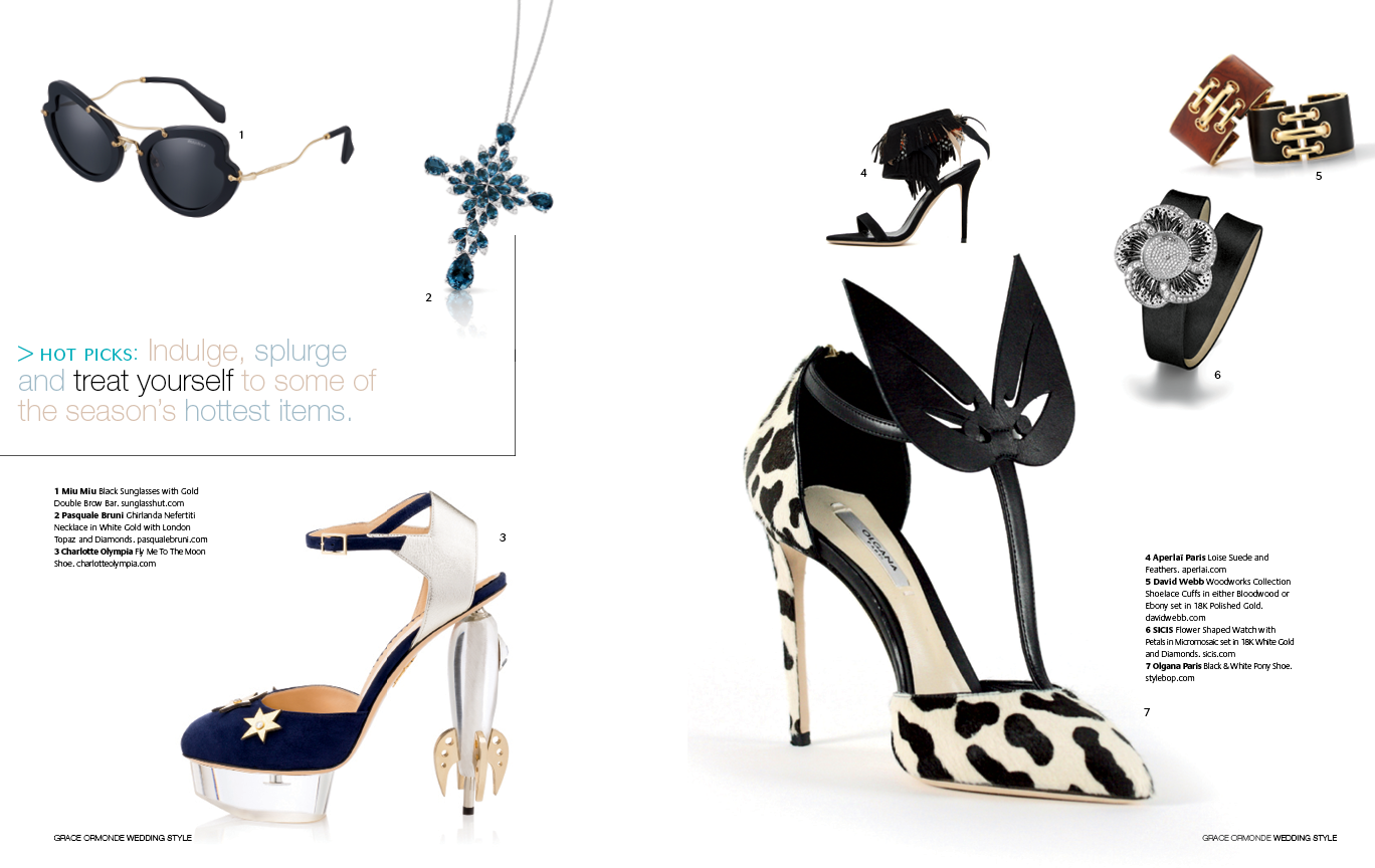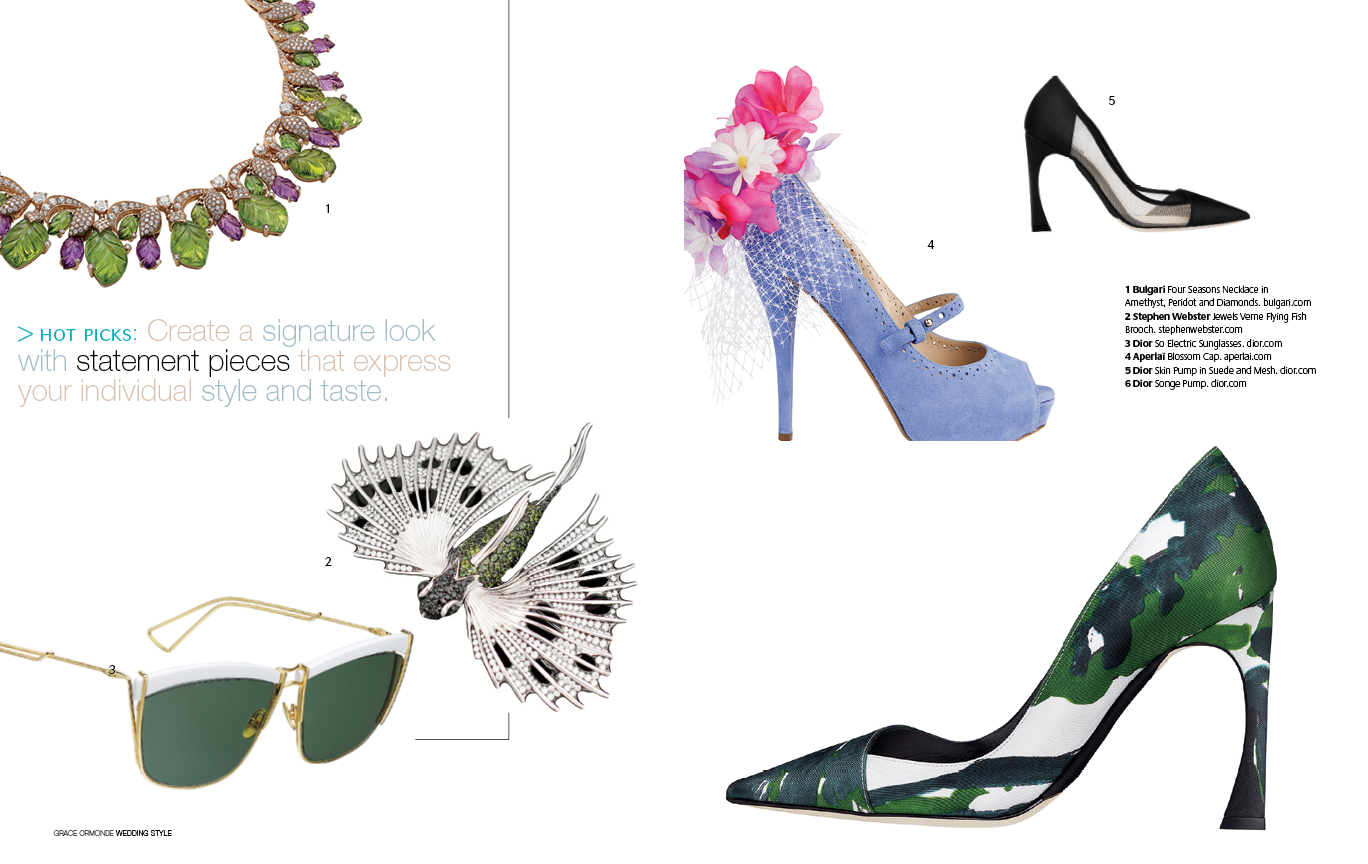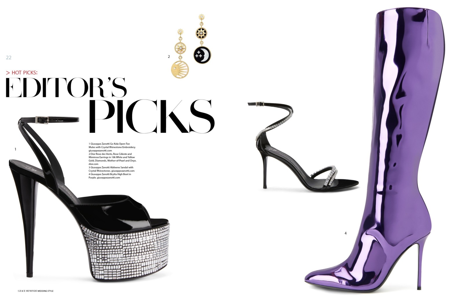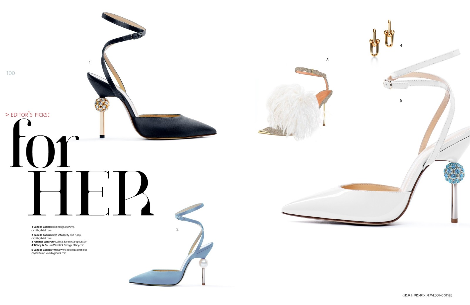 1 Camilla Gabrieli Black Slingback Pump. 2 Camilla Gabrieli Bella Satin Dusty Blue Pump. 3 Femmes Sans Peur Dakota. 4 Tiffany & Co. HardWear Link Earrings. 5 Camilla Gabrieli Vittoria White Patent Leather Blue Crystal Pump. This season’s HOT PICKS are dedicated to the brides who are buying anywhere from three to six pairs of shoes