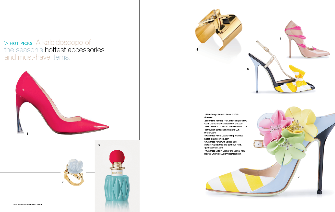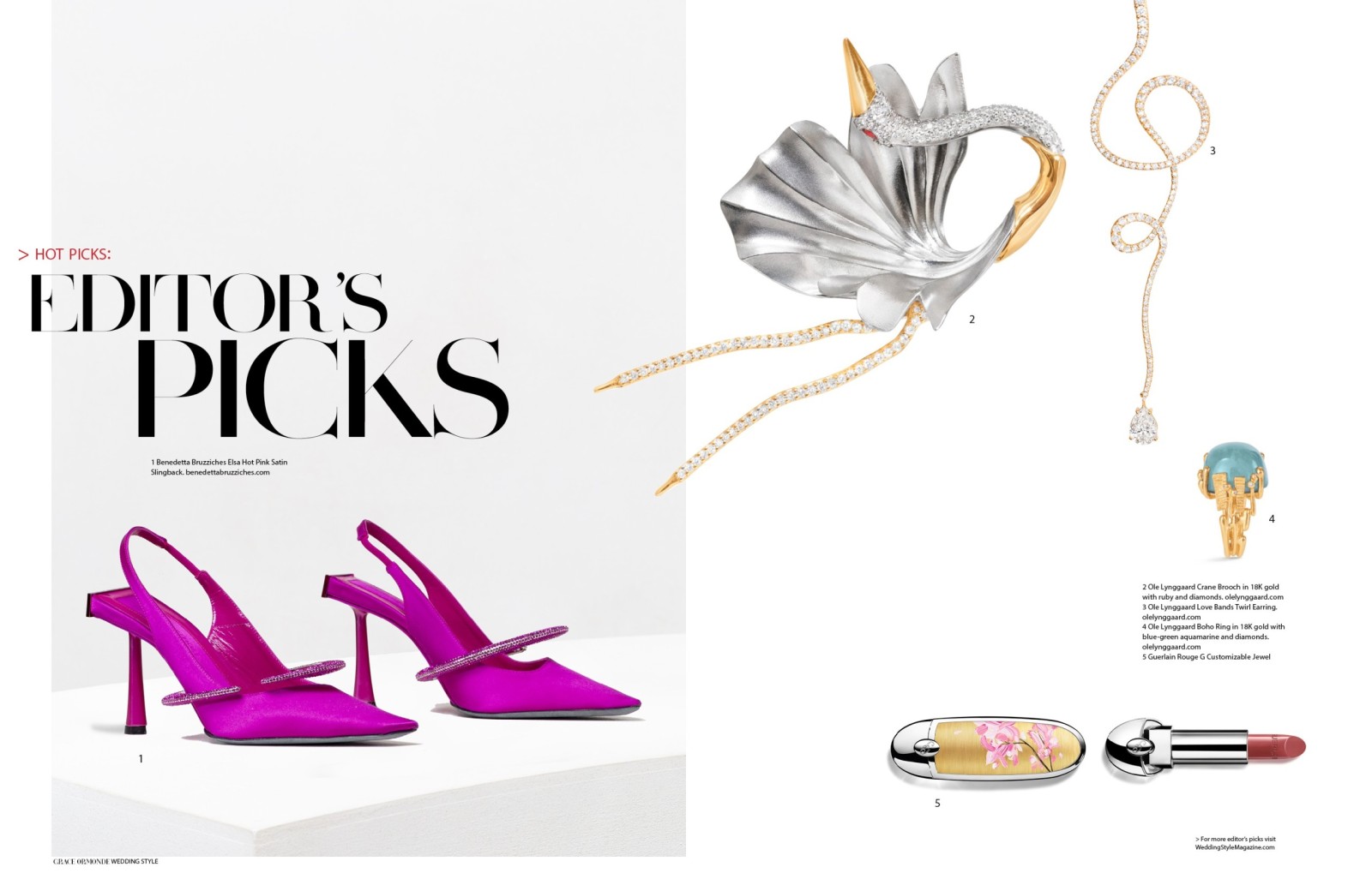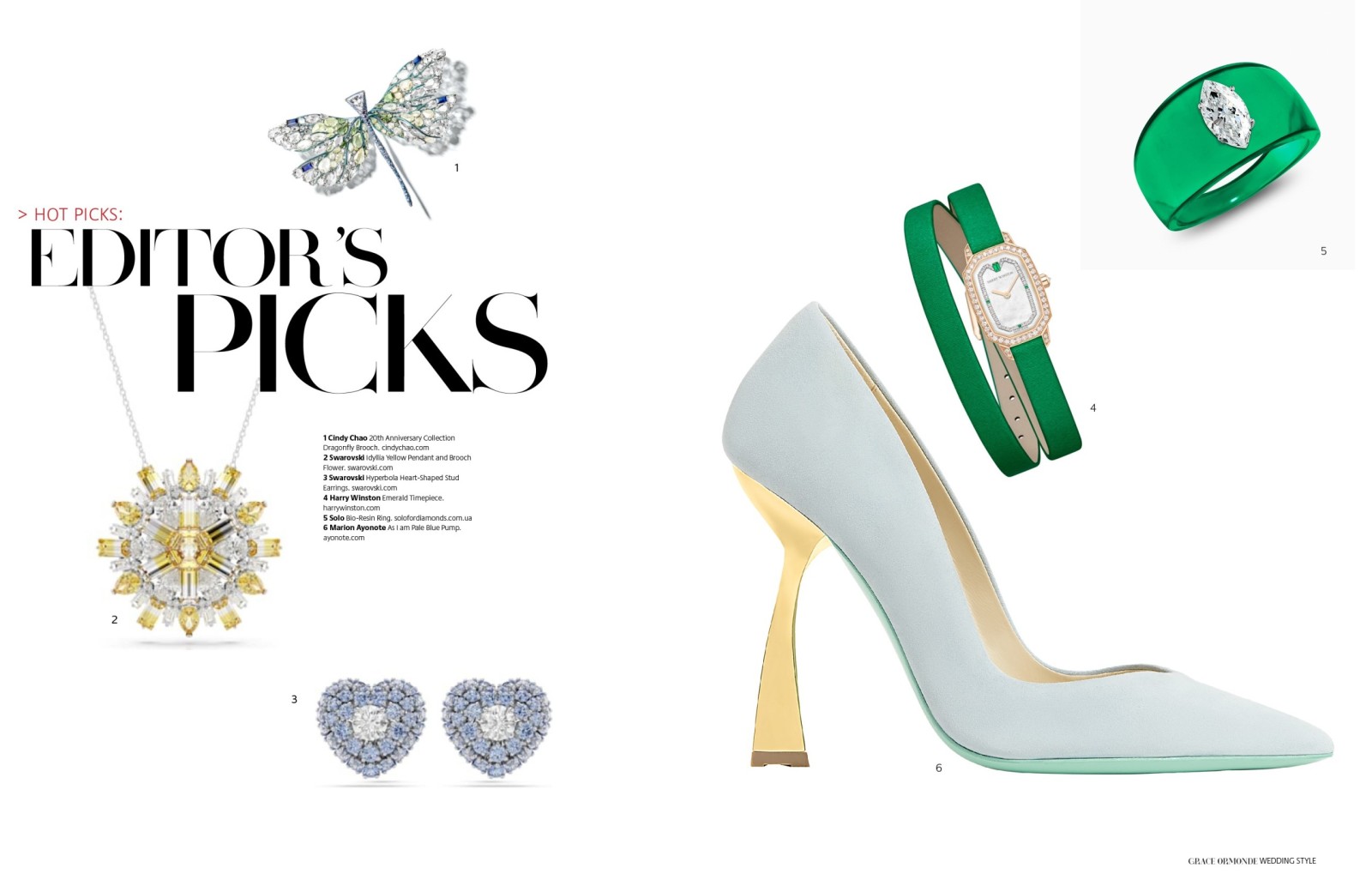 1 Cindy Chao 20th Anniversary Collection Dragonfly Brooch; 2 Swarovski Idyllia Yellow Pendant and Brooch Flower; 3 Swarovski Hyperbola Heart-Shaped Stud Earrings; 4 Harry Winston Emerald Timepiece; 5 Solo Bio-Resin Ring; 6 Marion Ayonote As I am Pale Blue PumpEDITOR’S HOT PICKS – SPRING 20251 Marion Ayonote Panthere Pink High Gloss Pump. 2 Lugano Diamonds