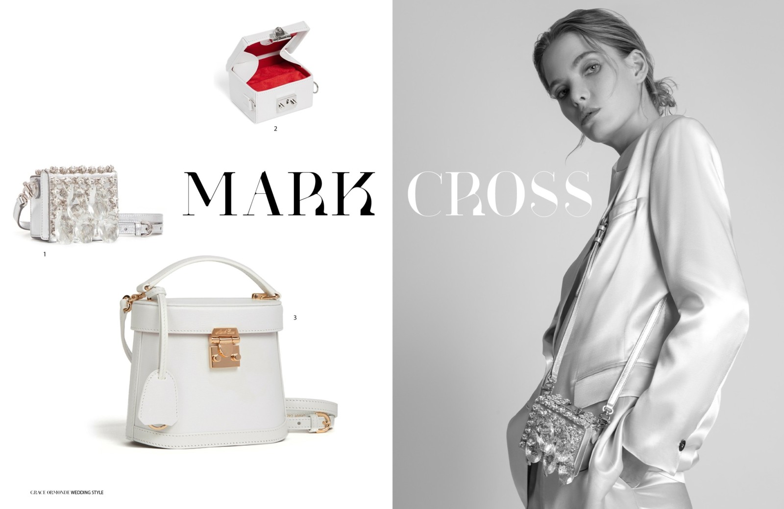 1 Mark Cross Grace Micro Embellished with Crystals. 2 Mark Cross Grace Micro Saffiano Calfskin Leather in Bright White. 3 Mark Cross Benchley Mini Saffiano Calfskin Leather in White. MARK CROSS – THE RESURRECTION OF AN AMERICAN CLASSIC Established in 1845 as a saddlery in Boston, Mark Cross is the quintessential American luxury lifestyle brand. For