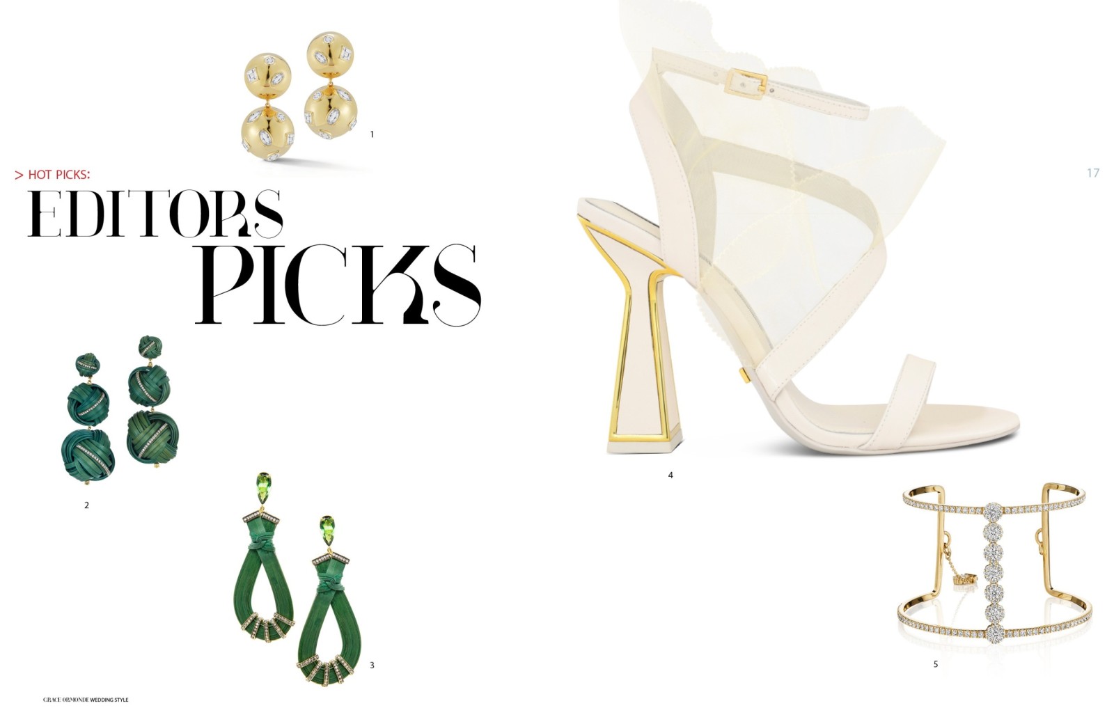 1 Seaman Schepps Malibu Earrings with white Topaz set in 18k Yellow Gold. 2 Silvia Furmanovich Green Bamboo Earrings with Diamonds and a Trio of Green Bamboo Spheres. 3 Silvia Furmanovich Green Bamboo Loop Earrings in 18k Yellow Gold, Diamonds and Green Tourmaline. 4 Kat Maconie The Amba Sandal. 5 Hueb Diamond Flower Bracelet in