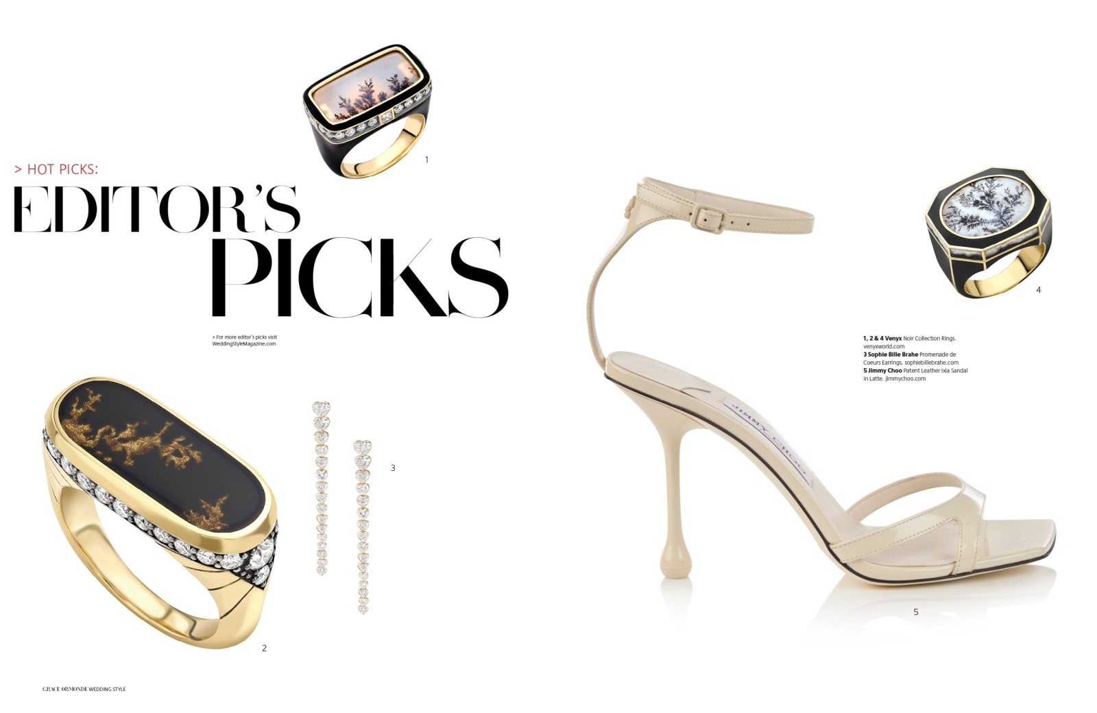 1, 2 & 5 Venyx Noir Collection Rings. 3 Sophie Bille Brahe Promenade de Coeurs Earrings. 4 Jimmy Choo Patent Leather Ixia Sandal in Latte.EDITOR’S PICKS – OCTOBER 20251 AMAFFI Savanna Perfume. 2, 3 & 5 Silvia Furmanovich Quintessence Collection Earrings and Clutch.4 Venyx Noir Collection Necklace. 5 Guerlain Patchouli Paris Perfume.1 Chanel CoCo Necklace Quilted Motif, 18K White Gold, Diamonds. 2 Chanel Coco Crush