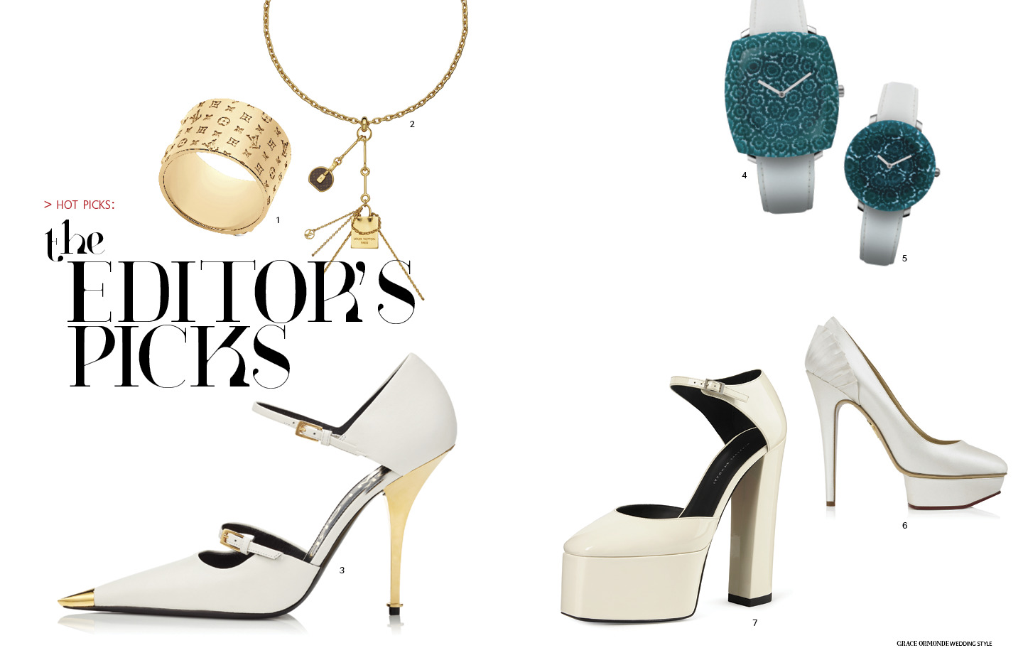 1. Louis Vuitton Nanogram Ring, $365; 2. Louis Vuitton Mini LV Pendant, $615; 3. Tom Ford Leather Mary Jane Pump in Chalk, $1,550; 4. and 5. Yunik Bora Bora Timepiece featuring Vegan Strap and Murano Glass Dial; 6. Charlotte Olympia Paloma Pump in White, $795; 7. Giuseppe Zanotti Bebe White Closed-Toe Platform Sandal, $995.1. Giuseppe Zanotti Farrah