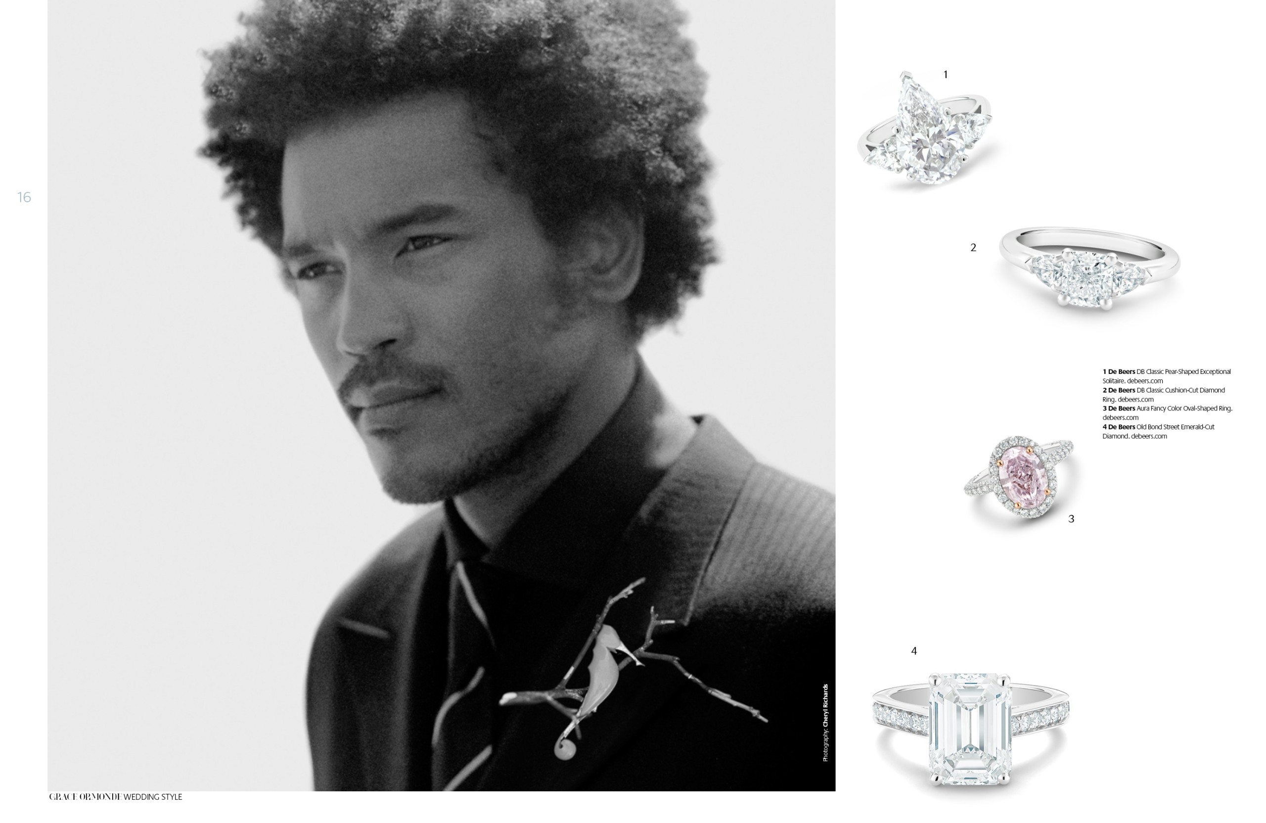 1 De Beers DB Classic Pear-Shaped Exceptional Solitaire. 2 De Beers DB Classic Cushion-Cut Diamond Ring. 3 De Beers Aura Fancy Color Oval-Shaped Ring. 4 De Beers Old Bond Street Emerald-Cut Diamond.